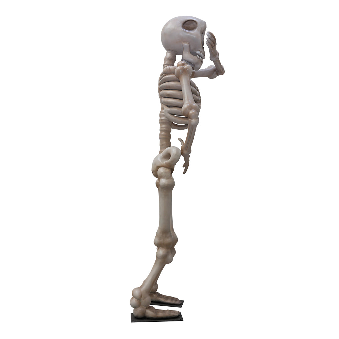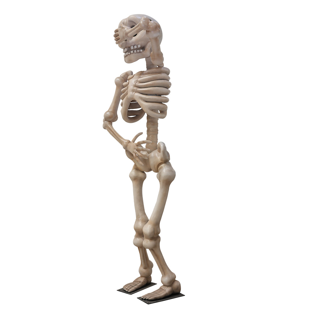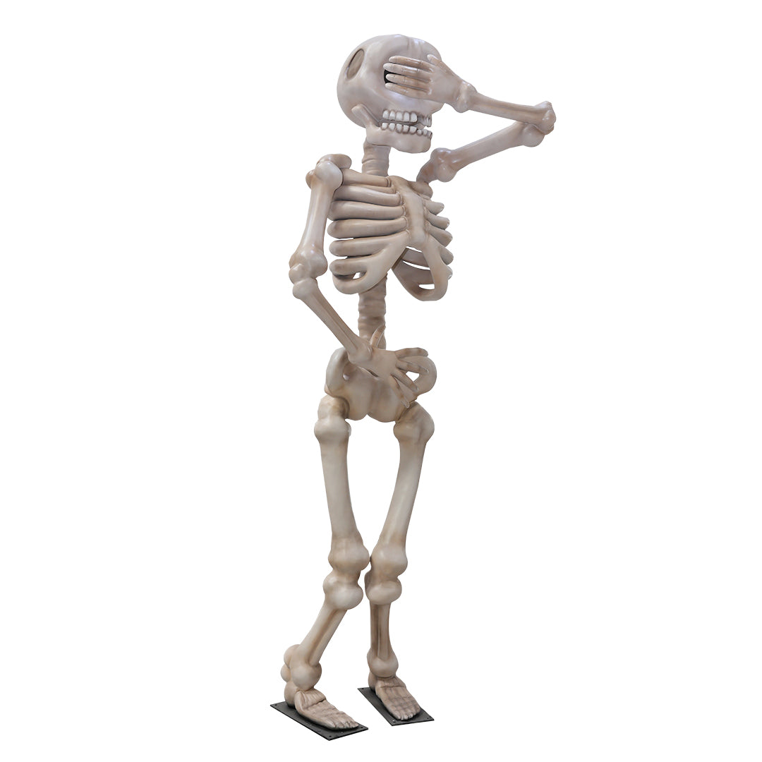 Over-sized shy skeleton fiberglass statue made for Halloween decoration or spooky scenes.
